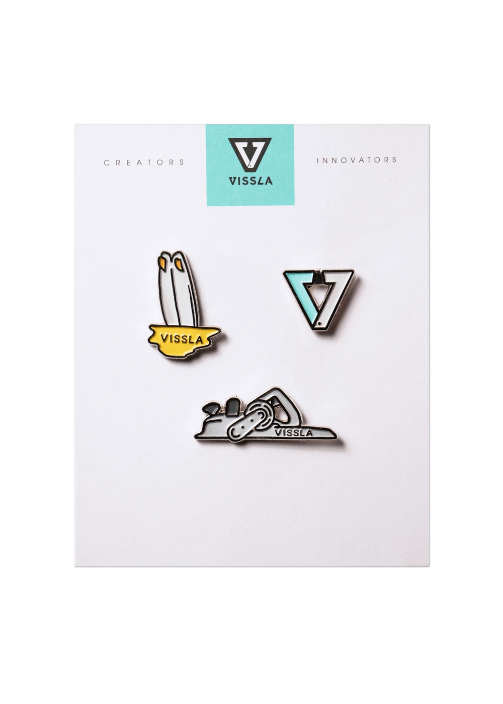 The Vissla pin pack includes 3 premium enamel pins featuring a caliper, surfboard and planer.
